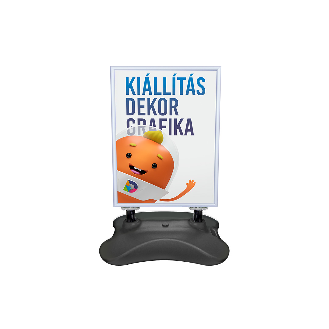 Kétoldalas, rugós záródású, 33 mm széles eloxált alumínium keret, tükröződésmentes fóliával. A keretet 2 db rugó rögzíti a műanyag talphoz, melyet vízzel tölthetünk fel. A vízzel teljesen feltöltött talp súlyánál fogva nagyon stabil, kültéri felhasználásra zord időjárás esetén is alkalmas.